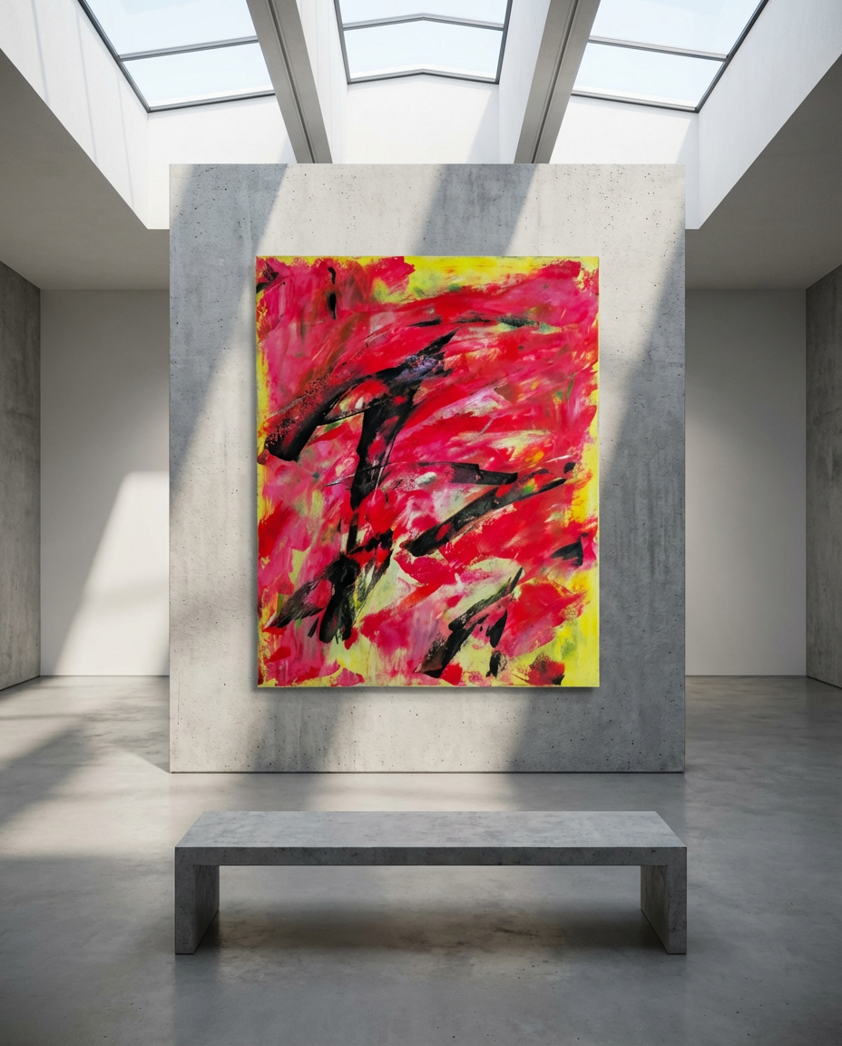by RYOS ARTX opens into a meditative stillness where awareness breathes before words, before feeling takes shape. The gestures move like echoes of consciousness itself—untranslated, instinctive, and free of narrative. Fierce reds and dark strokes pulse with intensity, yet they are held within a luminous field that suggests transcendence rather than unrest. In this space, color becomes both force and calm, revealing the quiet depth beneath the mind’s motion.