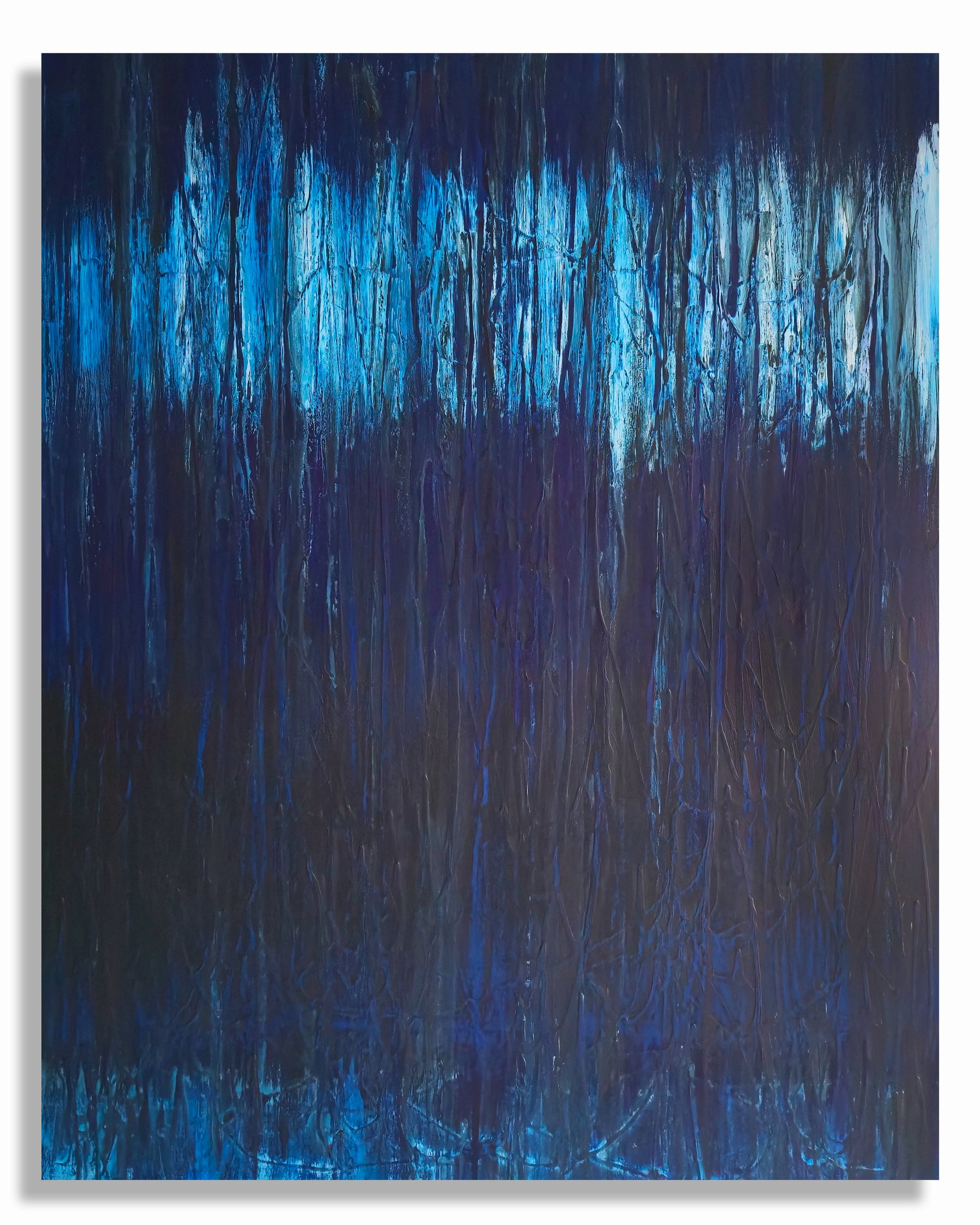 The composition visualizes Ulysses' emotional state as a battle between an overwhelming abyss and a defiant light. The heavy, textured darkness that dominates the canvas represents the crushing weight of his grief and two decades of suffering at sea. Cutting through this gloom is a brilliant blue horizon, the fierce and unwavering memory of Ithaca that serves as the sole beacon for his mind. The scarred, vertical striations evoke his weathered soul, constantly struggling against being pulled down by sorrow. Ultimately, the piece captures a consciousness where a single, stubborn hope is all that keeps the darkness from consuming him entirely.